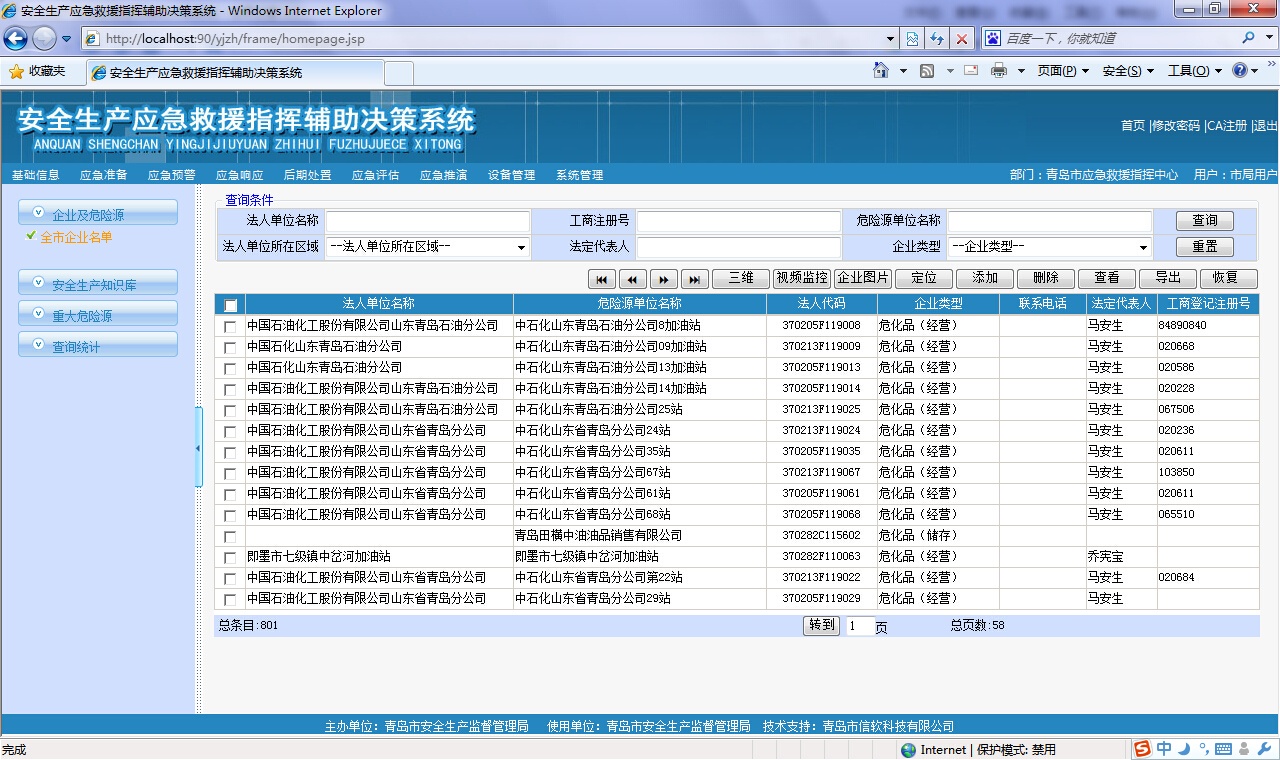 ? 對存在危險源的企業(yè)進行管理和查詢,可以按地區(qū)、經(jīng)濟類型、所屬行業(yè)等支持多種查詢條件進行綜合查詢,查詢結果提供企業(yè)和所屬危險源的具體信息、以樹形結構展示單位基本情況、及其附屬的安全評價、行政許可等分類信息,方便政府主管部門查看危險源企業(yè)的各種動態(tài)情況。可以在線查詢調(diào)閱危險源視頻監(jiān)控信息、三維模型信息、GIS詳細信息,企業(yè)及危險源信息可以導出到excel或者word中。