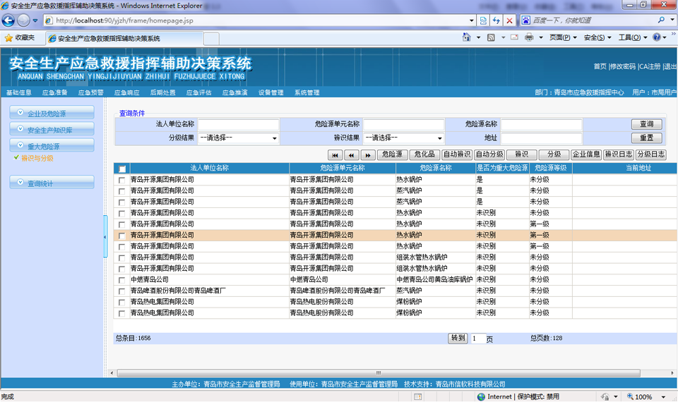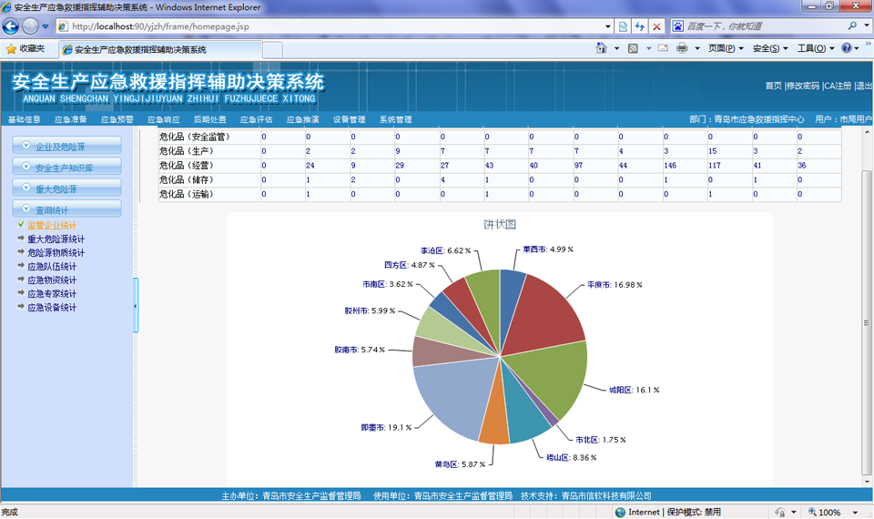 以醒目的報表形式,對重大危險源分布、監(jiān)管企業(yè)、危險物質(zhì)、應急資源進行統(tǒng)計列表展示,并支持多層次頁面鏈接方式查詢與瀏覽重大危險源、企業(yè)綜合信息,支持鉆取功能。并在此基礎上進行數(shù)據(jù)挖掘和深入分析,查詢結果既可以顯示為原始的文本數(shù)據(jù)也可以分類統(tǒng)計總和,提供柱狀、餅狀等各種形式的圖形。