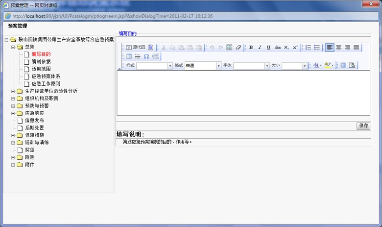 應急預案有綜合應急預案、專項應急預案、現(xiàn)場處置方案構成,由于綜合預案、專項預案、現(xiàn)場處置預案的目錄和編制內(nèi)容并不相同,在編制預案時,編制人員可隨時讀取預案模板或案例進行參考,系統(tǒng)并可提示幫助信息,輔助完成預案的編制、修訂。