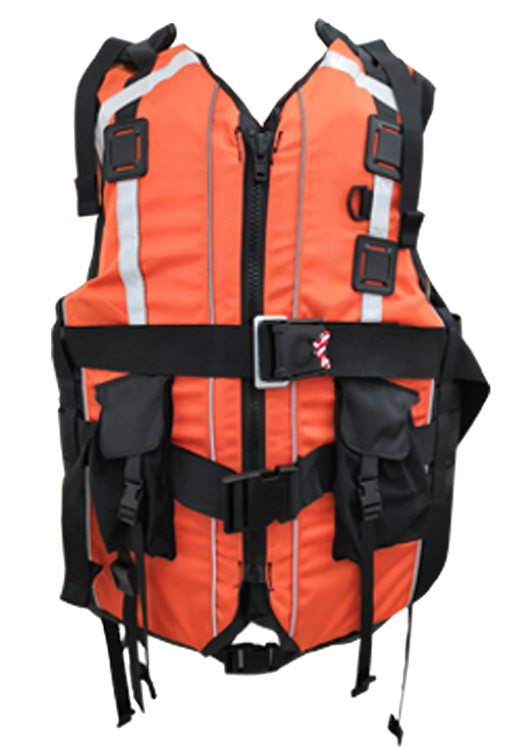 救生衣的面料采用方形針織壓力點和1680D材質的Cordura?面料,使得救生衣足夠應對復雜的水域活動。采用背心式設計,胸襟采用YKK塑鋼開口拉鏈,并使用塑料拉頭浮力片固定于布料夾層內,后領口增加手提式松緊提拉帶設計,方便于攜帶。