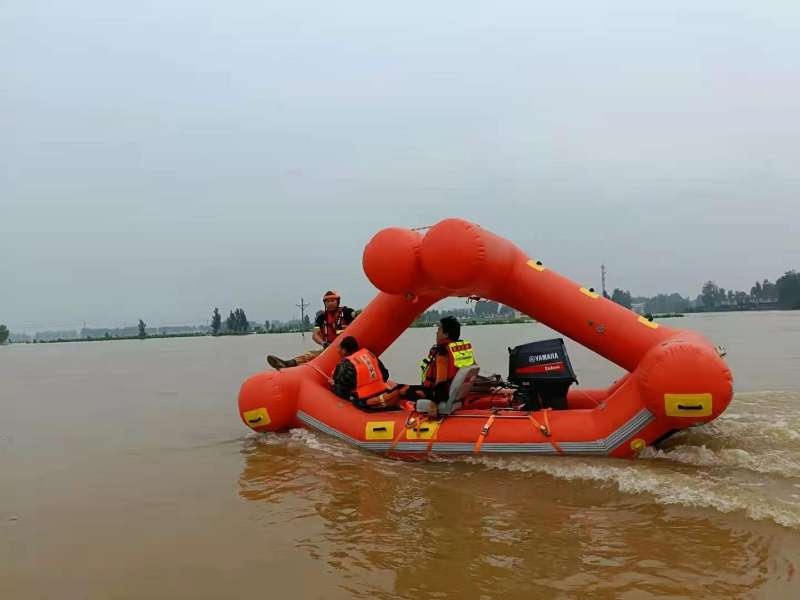 在救援過程中,由凌天智能裝備自主研發的多艘大型充氣救援運輸船成了新鄉、衛輝等指定作戰區域的“諾亞方舟”。李金玉介紹,大型充氣救援運輸艇一次性可以運輸40人,折疊后體積小巧,便于運輸攜帶,無需特殊車輛進行運輸。“在新鄉災區,短短幾個小時便轉移群眾500多人,在搶險救援中發揮了重要作用。”