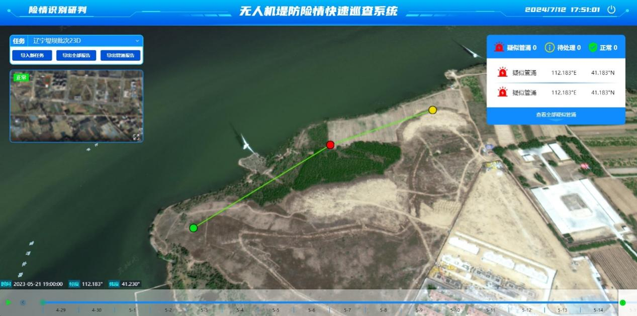 系統(tǒng)主要針對汛期堤防滲漏、管涌、塌陷場景進(jìn)行快速排查隱患需求,以無人機(jī)搭載雙光相機(jī)匹配原理,結(jié)合人工智能辨識算法形式進(jìn)行巡查;系統(tǒng)設(shè)計化繁為簡,具備GIS高清底圖,能夠展示村莊、河道名稱及經(jīng)緯度信息,數(shù)據(jù)支持一鍵處理,保障高效運行。