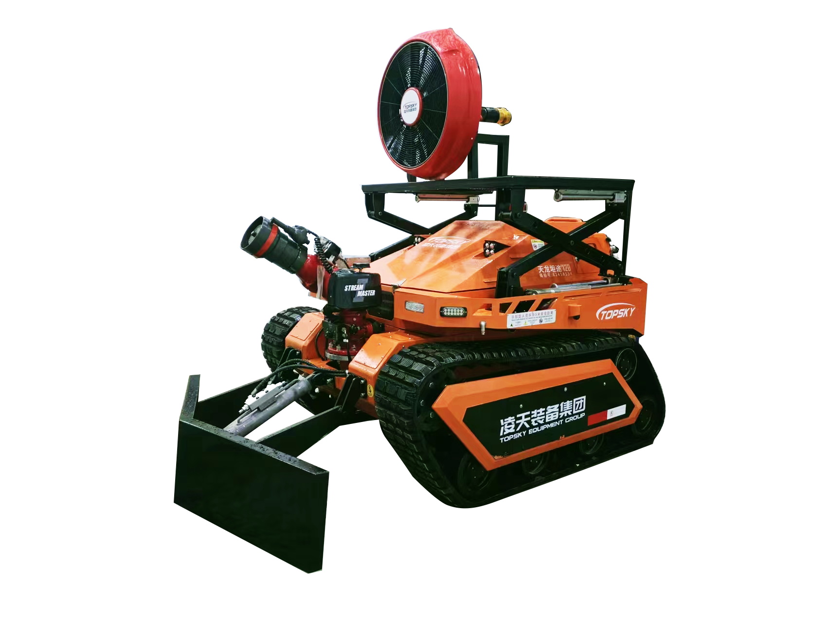 消防排煙滅火機器人是一款履帶式中型油動力消防滅火機器人,采用柴油發(fā)動機為動力,閉式液壓系統(tǒng)驅動ASV橡膠履帶進行高速行走,搭載了每秒120升的大流量消防炮,具有60000m3/h的可升降大流量水力排煙機,及V型推鏟,攜帶多種檢測、監(jiān)控傳感檢測裝置,對火災場所實施遠程實時監(jiān)控,進行火災撲滅、煙霧及有毒有害氣體驅散,道路開辟清障。