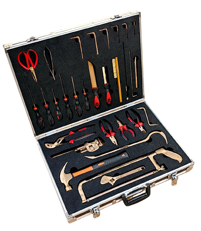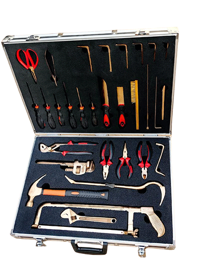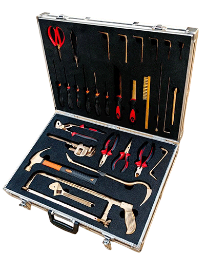 NMT-WA03型號無磁排爆工具組通常為36件套。工具由鈹青銅合金制成,裝在堅固的硬質箱體內,箱內有四個可拆卸嵌體,便于工具的分類存放與攜帶。