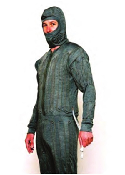 水冷服包括長袖上衣(軀干和胳膊部位的冷卻)、長褲(腿部的冷卻)、露臉包頭式帽子(頭部和頸部的冷卻)、制冷裝置、2個(gè)水瓶(2升容量)、電池組、運(yùn)輸包