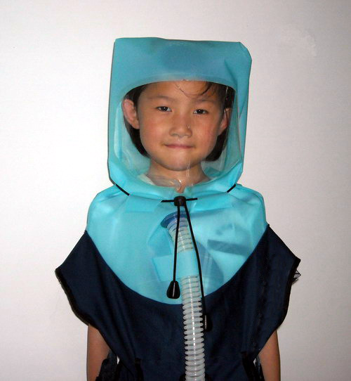 適合兒童(3—8歲)使用,為有效回避戰(zhàn)爭毒氣或有害環(huán)境而設(shè)計的防毒面罩。利用送風(fēng)機將外部空氣通過濾毒罐送入頭罩內(nèi),形成密閉正壓,使得呼吸方便,活動無不適現(xiàn)象。